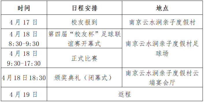 为激发校友体育热情和爱校情怀,展示校友风采,增进校友情谊,推动校友足球事业发展,加强各校友联谊会及校友之间的交流与合作,学校决定举办第四届“校友杯”足球联谊赛。具体安排如下: