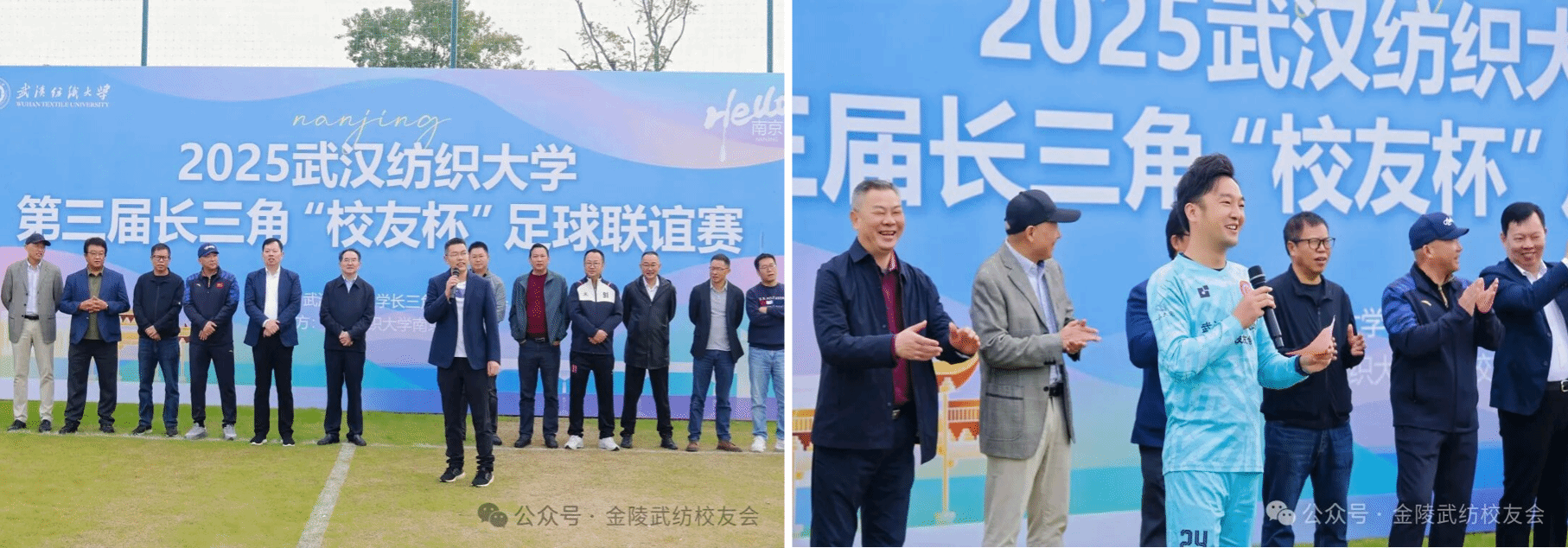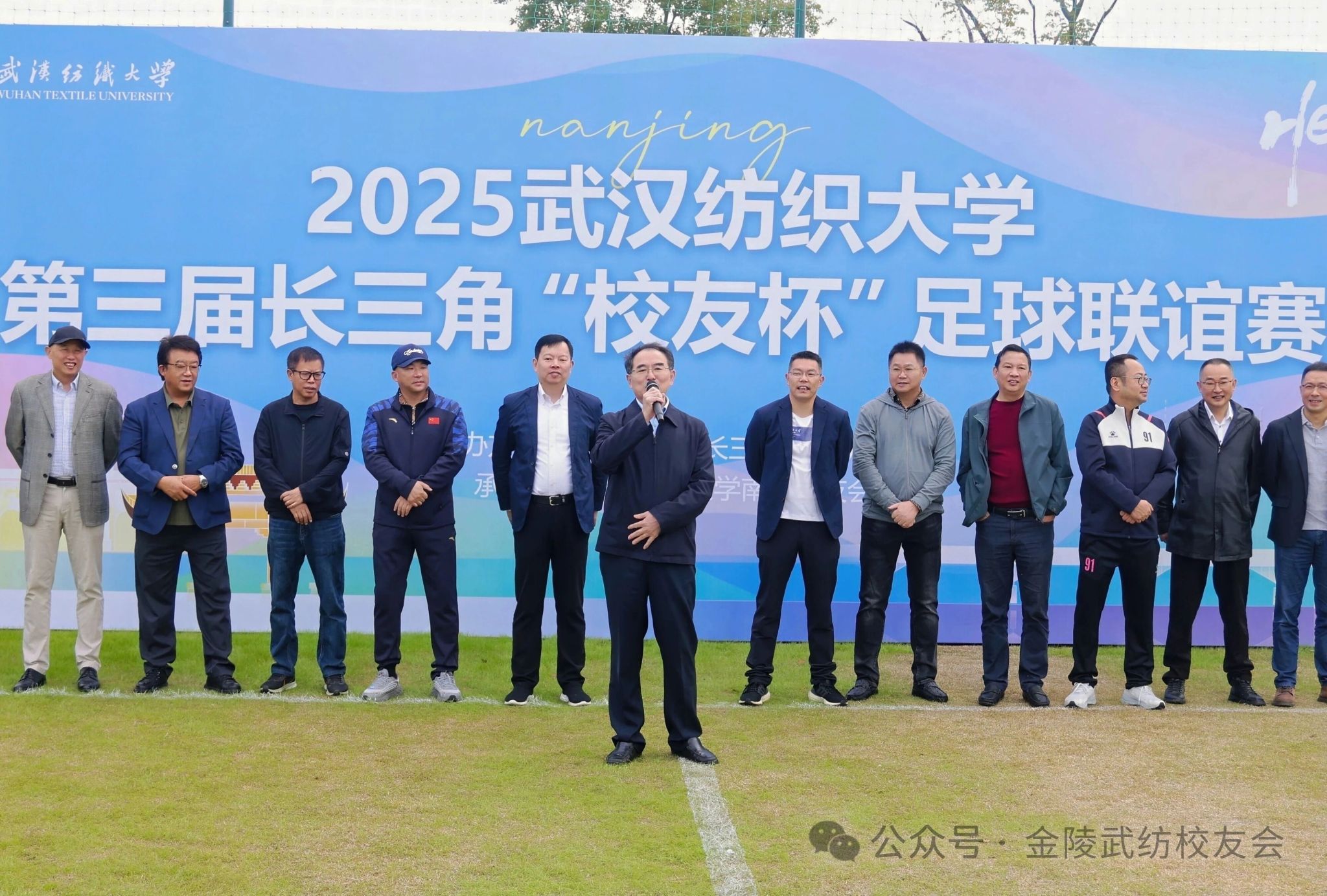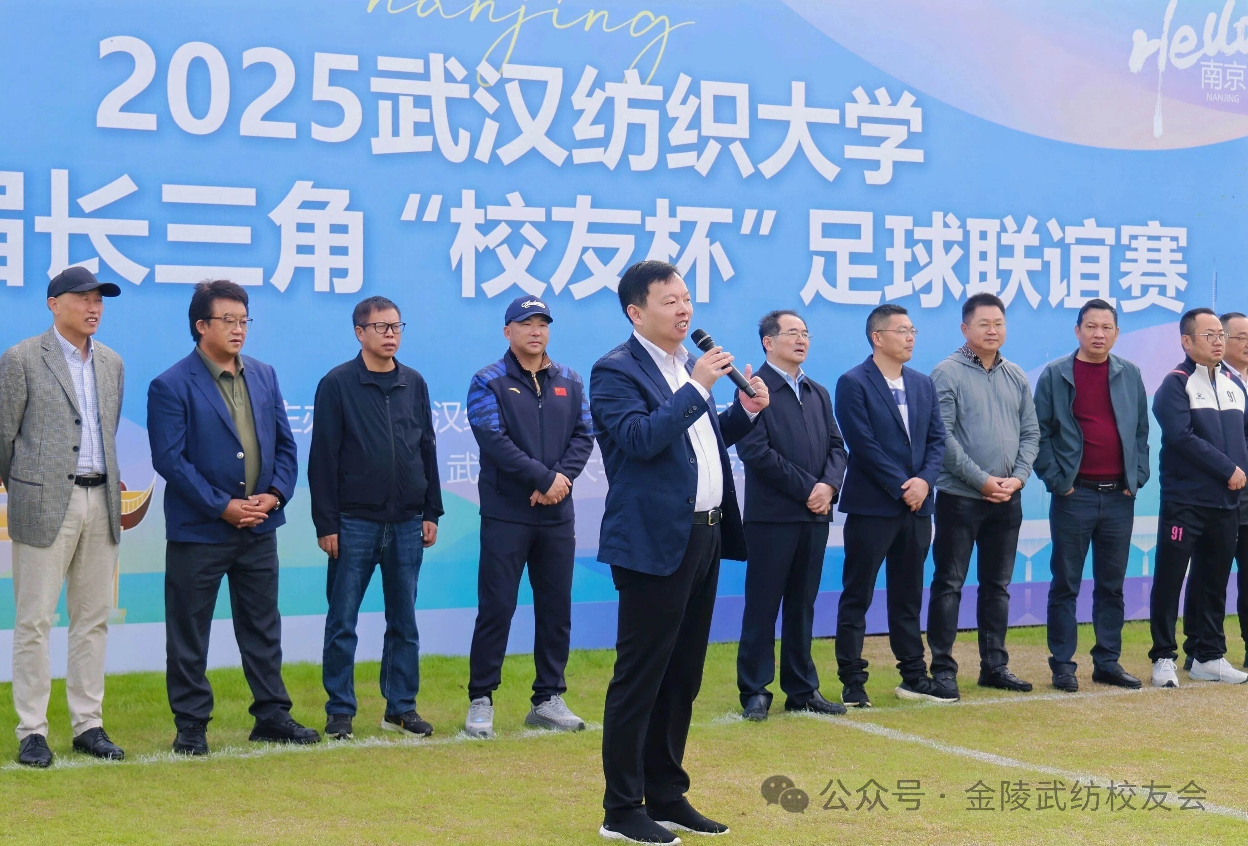 校友会会长田辉玉教授为大赛致辞。田辉玉表示,当前“苏超”赛事风靡全国,而长三角“校友杯”足球联谊赛,则是属于纺大人的独特足球盛宴。近年来,学校校友足球文化蓬勃发展,各地校友联谊会纷纷组建足球队,积极参与地方赛事,定期交流球技、联络感情,更以饱满的热情投身母校历届校友杯赛事,为校友文化建设贡献了重要力量。他指出,孙家军校友倾情支持校友足球事业,不仅由华瑞时尚集团独家冠名赞助“苏超”南京赛区,还以个人名义资助本次赛事,这份深情,生动诠释了纺大精神,也为校友文化的持续发展注入了强劲动力。他表示,学校将继续大力支持校友足球等品牌活动,并不断拓展更多交流平台,促进校友之间愉悦回忆、经验分享、深化合作,进一步增强校友与母校之间的情感纽带与发展共识,共同构建好“校友-母校发展共同体”,助力美好纺大建设不断迈上新台阶。最后,他预祝本次大赛取得圆满成功。