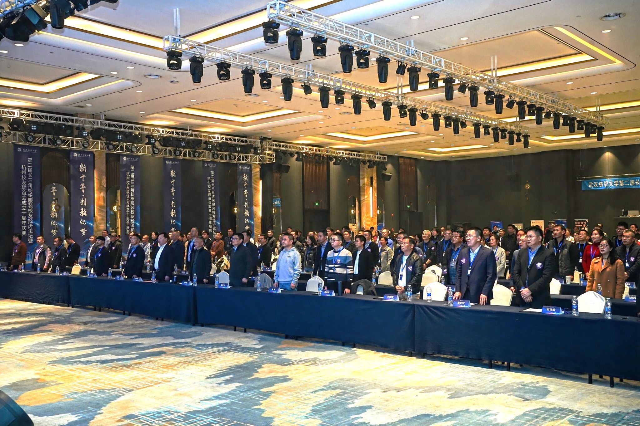 当天下午,第二届长三角纺织服装校友经济论坛盛大开幕,全体起立齐唱《武汉纺织大学校歌》。罗锦银为活动致辞。他指出,长三角地区是全国纺织服装产业最为集聚、创新活力最强的区域之一,学校高度重视校友的凝聚与联动,期待广大校友在“缘、益、趣”理念的指引下,在校友足球赛、校友经济论坛、值年返校三大品牌校友活动的持续赋能下,进一步推动校友情感联结与资源协同,以创新链、产业链融合为支点,助力学校人才培养与校友企业发展同频共振、共同进步。希望杭州校友联谊会以及全国各地校友联谊会能够因地制宜发挥各自资源禀赋优势,构建跨区域校友协作网络,激活校友经济生态圈的内生动力,为学校人才培养、毕业生实习就业和创新创业提供更广阔平台。